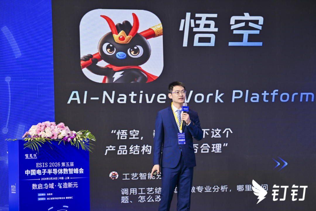 活動開始前,釘釘悟空事業部屹炎在「2026中國電子半導體數智峰會」上重點介紹了 AI 原生工作平台悟空。他指出,半導體行業對 AI 的採用具有明顯的「穩進」特徵,企業真正關注的並不是技術創新,而是安全、合規、成本與回報之間的平衡。