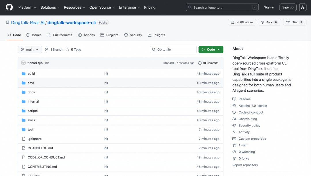 10 天後,釘鈴將這套 CLI 功能正式開放原始碼。開發者與 AI Agent 不需了解底層 API 細節,僅需一行指令即可調用企業級功能。項目已在 Github 發布,搜尋「dingtalk-workspace-cli」即可訪問,開發者與企業可透過 README 加入官方社群,參與功能共建。