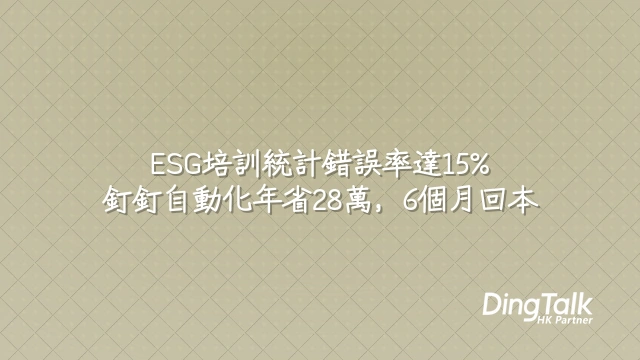 企業導入釘釘後,平均每年節省28萬港元合規成本,投資回收期少於6個月。過去編製ESG培訓報告需HR投入逾120小時:跨部門蒐集、格式統一、反覆核對,以每小時250港元計算,光工時成本就達3萬;若加上修正與外部顧問費用,總支出常破35萬。