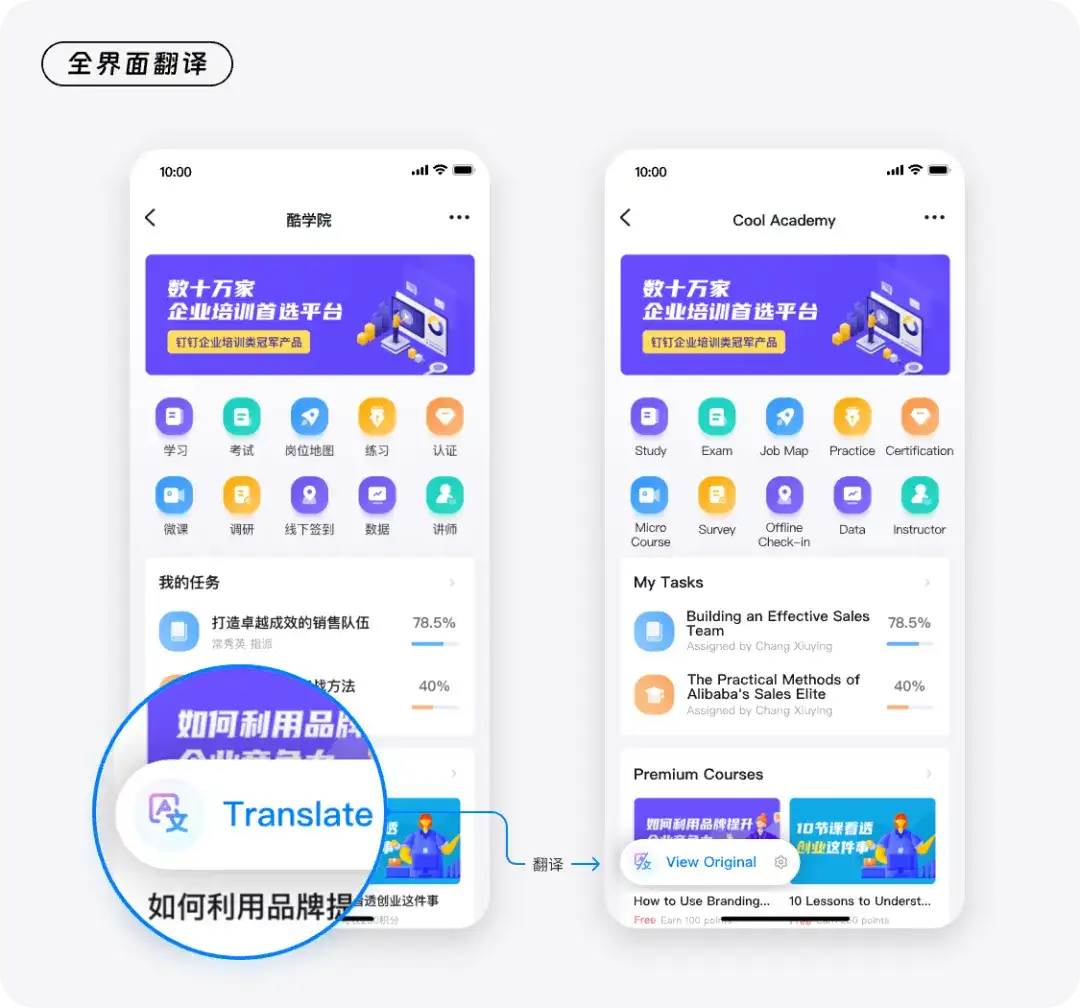 釘釘的「全界面翻譯」產品能力很好解決了這個問題,免費開啟,界面上會出現「浮動」翻譯按鈕,點一下,即可將「酷學院」所有產品功能界面上的文字,翻譯成海外員工指定的語言。