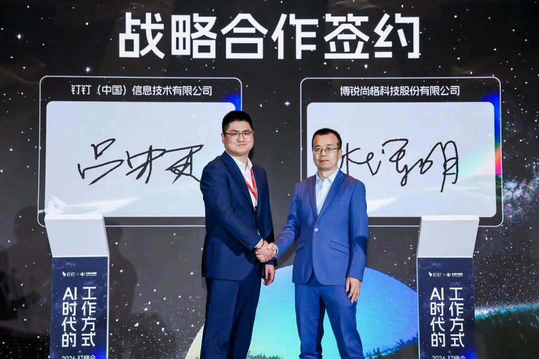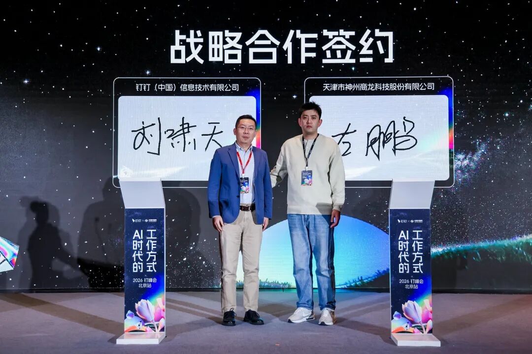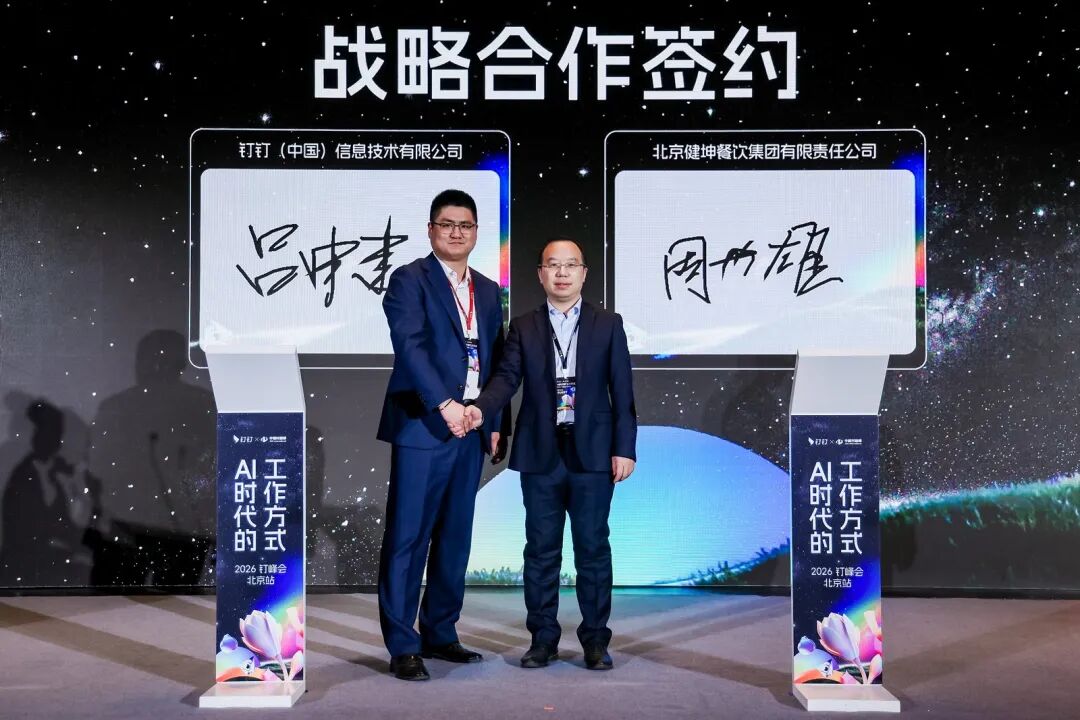 現場,一批北京地區企業與釘釘集中簽約,共同邁入AI時代的工作方式,包括博銳尚格科技有限公司、天津市神州商龍科技有限公司、北京健坤餐飲集團、北京央視瑞安技術服務有限公司等。