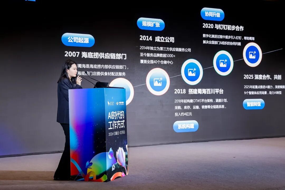 蜀海曾是海底撈供應鏈部門,2014年起獨立為第三方供應鏈服務公司。2020年起,蜀海引入釘釘,幫助解決組織的協同問題,2025年起重點推進AI能力,深度賦能多個智能體應用場景,助力AI轉型。
