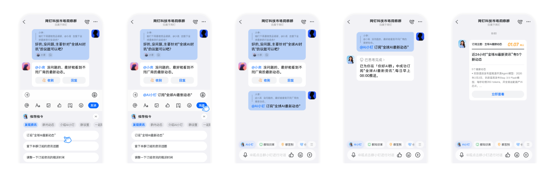 群成員可自定義關注關鍵詞(如「春節相關資訊」、「AI領域前沿熱點」、「大宗商品行情趨勢」、「生物科學前沿」),AI小釘將聯動「發現資訊」資訊源,每日定時向群內精準推送高價值內容,幫助成員即時掌握行業動態。