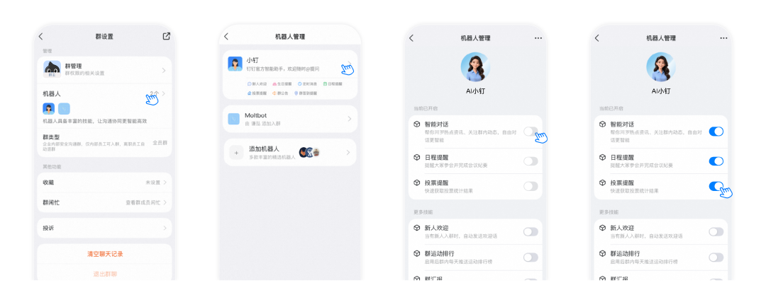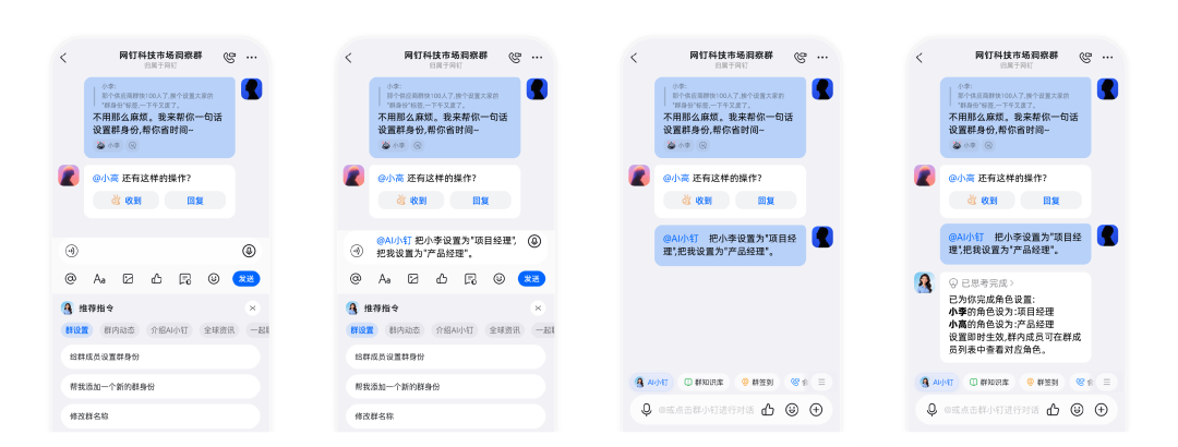 群管理員可透過自然語言對話完成群管理操作,如設定快捷欄應用、修改群名稱、批量設定成員身分等。例如輸入「@AI小釘,把張三、李四、王五設為項目經理」,一句話即可完成批量設定,無需逐個點擊。