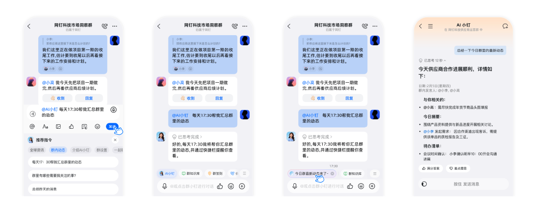 第二,作為最了解群內資訊與數據的Agent,AI小釘能充分激活每個釘釘群,透過智能推送與總結,加速高價值資訊的流轉。