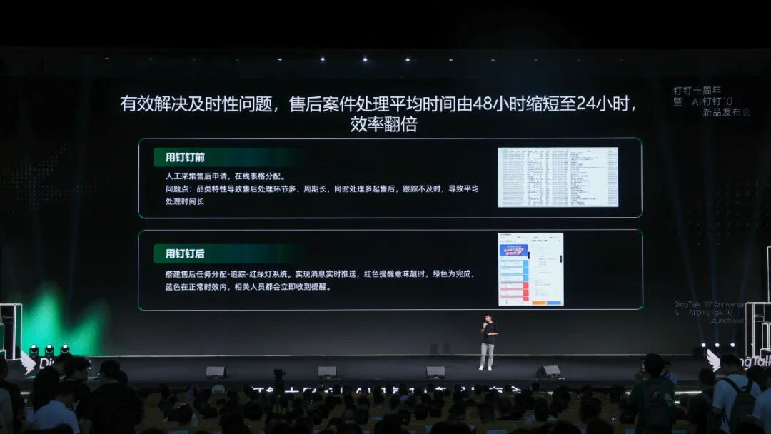 引入釘釘後,雙方共同打造「紅綠燈」協同系統。售后人員登記客戶問題後,系統將即時資訊精準推送到相關責任方,並按問題類型自動分類流轉。每個環節設定響應時效,以「紅綠燈」直觀顯示狀態:綠燈正常、黃燈預警、紅燈超時。這不僅成為考核效率的核心指標,也解決了資訊不同步的難題。
