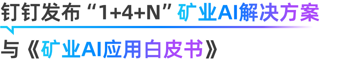 釘釘在會上正式推出全新的「1+4+N」礦業 AI 解決方案。「1」代表一個統一平台,作為整體解決方案的核心支撐;「4」涵蓋四大關鍵場景:智能礦山建設、生產安全管理、資源調度優化和供應鏈協同;「N」指基於該框架的多個可配置應用模塊,如井下人員定位、設備遠程運維、智能能耗分析等。