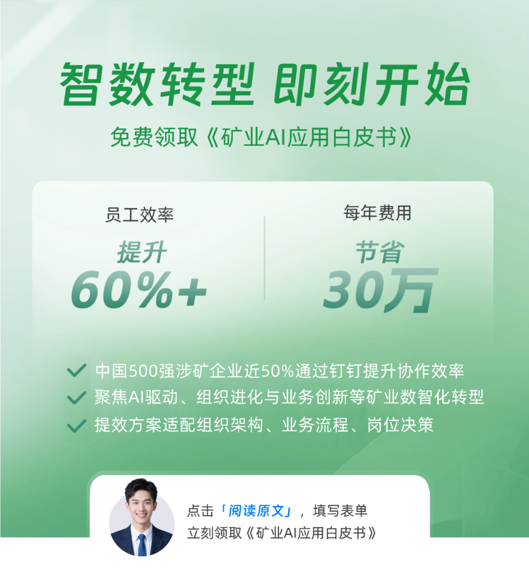 釘釘聯合同中國礦業聯合會發佈《礦業 AI 應用白皮書》,系統梳理了礦業企業在全球化協同、AI 落地、生產安全與綠色轉型中的挑戰與路徑,為行業提供可複製、可落地的 AI 實踐指南。讀者可透過文末連結獲取完整內容。