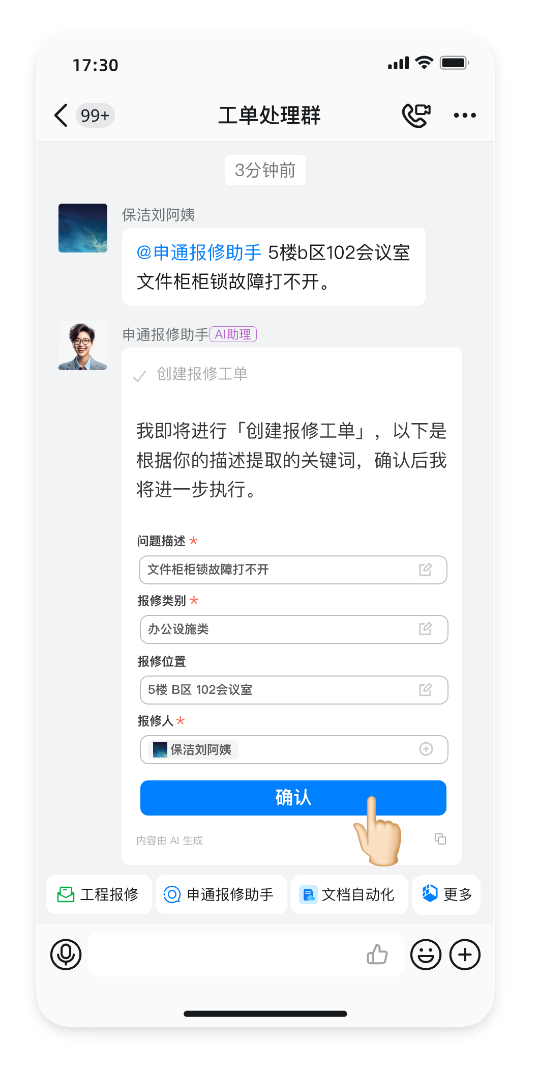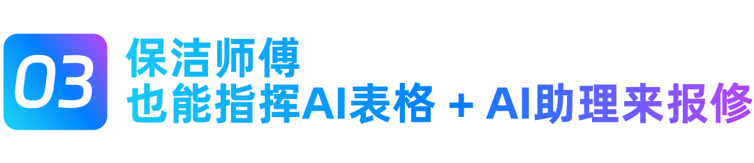 AI 助理自動提交工單:創建「申通報修助手」,員工可透過群聊或@助手描述問題,清潔工掃碼後直接語音,AI 自動生成並提交工單,極大降低操作門檻。