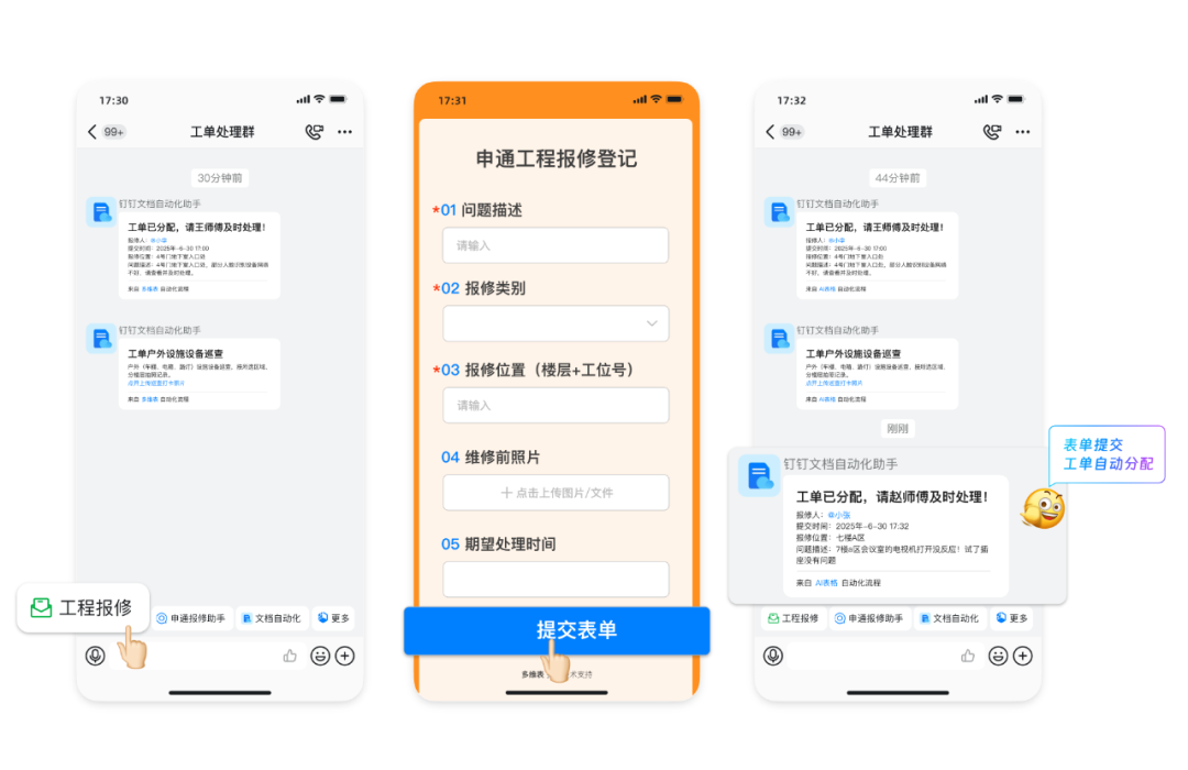 AI助理自動提交工單:創建「申通报修助手」後,員工可通過群聊或@助手描述問題,清潔工掃碼後直接語音,AI即自动生成並提交工單,極大降低操作門檻。