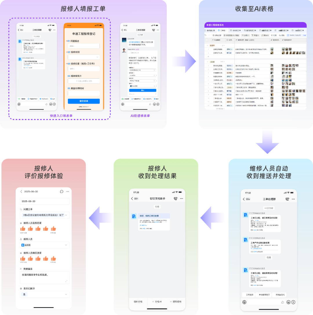 基於釘釘AI表格構建的工單報修系統,將流程劃分為四大模塊:報修人、維修人員、跟蹤進度、評價反饋,並形成可視化管理鏈條。