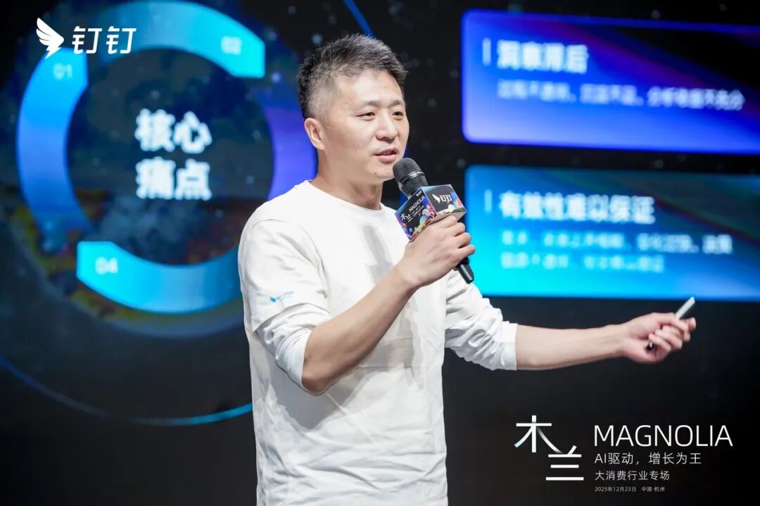 釘釘大消費行業解決方案負責人宋博發佈釘釘面向消費行業的AI解決方案,旨在解決業務場景複雜、系統林立、新人上手慢、洞察難落實等核心挑戰。其核心理念是讓員工「只需看到他此刻需要知道的一切」,並由系統主動告知「該做什麼、為什麼做、怎麼做」,從而將AI深度融入業務流,激活沉睡的流程與數據價值。