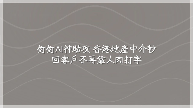 有AI幫手,真係連打字都可以甩皮?香港地產界最近流行一句笑話:「以前睇樓靠雙腳,而家回訊靠AI。」釘釘AI一出,客戶凌晨三點問「呢個單位可唔可以做高成數按揭」,唔使等朝早,秒回!重點唔係快,而係準——AI背後整合咗金管局最新指引、銀行實際審批尺度,甚至計到邊間銀行過往對同類屋苑嘅批核率最高,簡直似個廿四小時在線財務顧問。