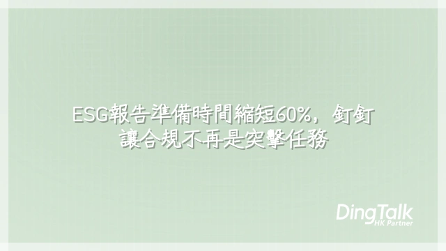 這意味著什麼?一家製造企業導入後,ESG數據彙整工時減少70%,準確率達98%以上。根據2024年亞太區可持續發展數位化報告,六成企業因數據斷點重報,平均成本高達港幣$37萬。釘釘解決的不是效率,是底層治理結構。