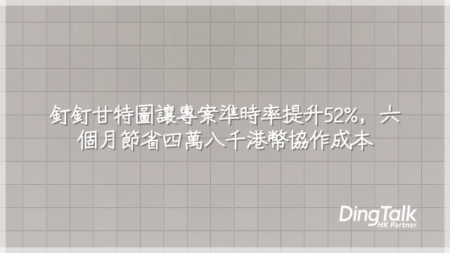 透過釘釘(DingTalk,阿里巴巴旗下企業協作平台,支援即時溝通與工作流自動化)內建的甘特圖功能,你無需額外採購專案管理工具即可實現視覺化排程。這不僅降低IT導入成本(平均節省HK$8,000/專案),更提升跨部門協作效率——根據2024年亞太區SMB數位轉型報告,使用整合式協作平台的團隊完成專案速度快32%