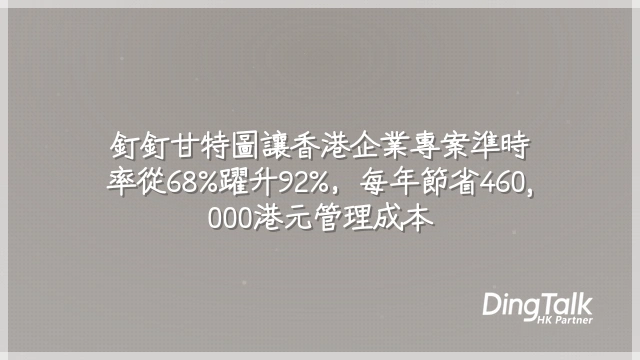 • 節省工時 × 平均薪資:以香港中型企業(50人團隊)為例,每月因任務重疊與溝通誤差耗損約120工時;釘釘甘特圖(提供自動排程與資源負載視覺化)可減少40%協調時間,年省576工時,折合港幣逾$460,000人力成本。