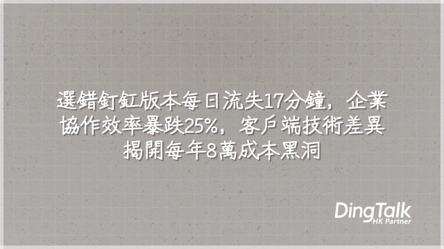 好多公司搞唔清楚要用釘釘網頁版定客戶端,係因為兩者表面功能相似,但底層架構截然不同,導致實際體驗差異極大。錯誤選擇可令員工效率損失15%-25%,尤其在跨時區協作與即時溝通場景中更為明顯。根據2024年亞太區遠程工作效率報告(由IDC發布,專注企業數碼工具ROI分析),僅43%企業有制定明確的內部工具使用指引,反映決策盲點普遍存在。