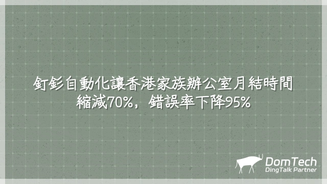 一個資產規模逾50億港元的多家族辦公室(MFO)在採用釘釘後,成功將每月結帳時間縮減70%,報告錯誤率下降95%,並強化董事層即時監控能力。該機構總部設於中環,分支遍及新加坡與倫敦,原流程依賴Excel與電郵審批,導致版本混亂與協作延遲。