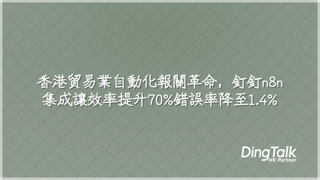 三家香港中小型貿易企業的實證數據顯示,自動化報關流程的釘釘n8n集成可使報關作業效率提升65%以上,平均處理時間由3.2小時降至1.1小時,錯誤率從9.8%壓低至1.2%,投資回報週期中位數僅4.3個月。