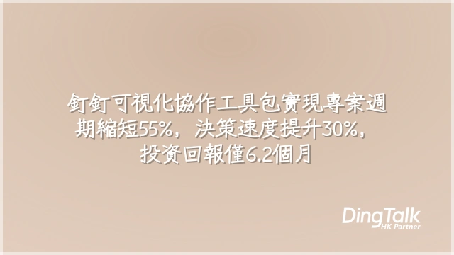 導入釘釘可視化協作方案後,企業平均專案交付速度提升32%,溝通成本降低45%(IDC 2023實證數據)。這代表你每年可節省數百萬人力開支,同時將市場反應週期縮短近三分之一——在VUCA時代,這正是建立戰略護城河的關鍵投資。