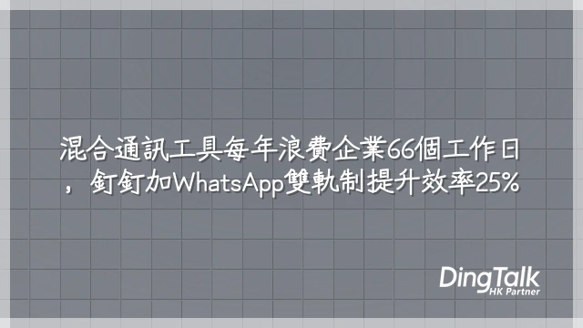 轉向「釘釘處理公務、WhatsApp保留私聊」的雙軌模式,已不是選擇,而是效率升級的必要變革。根據2024年亞太區調查,混合使用通訊工具的團隊平均每天浪費18分鐘追蹤跨平台任務——每年損失超過7個完整工作日。